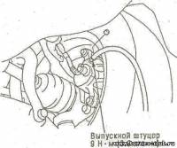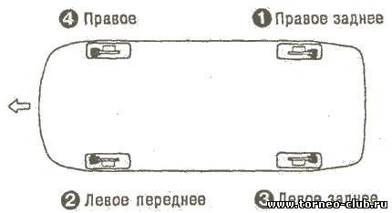 1 Убедитесь, что тормозная жидкость в наполнительном бачке налита до верхнего (МАХ) уровня. 2. Воспользуйтесь чьей-нибудь помощью, чтобы медленно нажать на педаль тормоза несколько раз, затем постоянно надавить на педаль. 3. Ослабьте выпускной штуцер тормоза, чтобы воздух мог выйти из системы. Затем надежно закрутите выпускной штуцер. 4. Повторите этот порядок для каждого колеса в последовательности показанной внизу до тех пор, пока в жидкости перестанут появляться пузыри. 5. Наполните наполнительный бочок главного тормозного цилиндра до верхнего уровня. Последовательность прокачки: