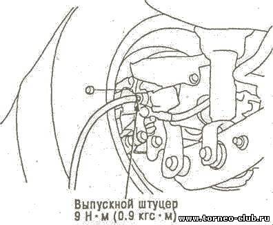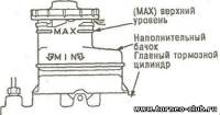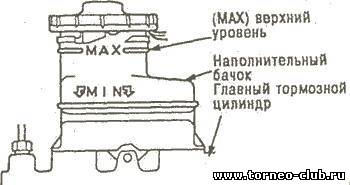 Примечание: наполнительный бочок на главном тормозном цилиндре должен быть наполнен до верхней отметки МАХ в начале прокачки и проверен после прокачки каждого тормозного механизма. Добавьте жидкость как требуется. Используйте только тормозную жидкость DOT3 или DOT4.